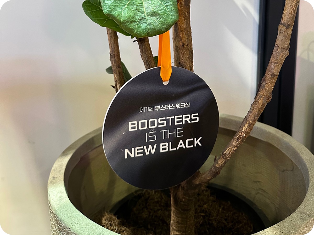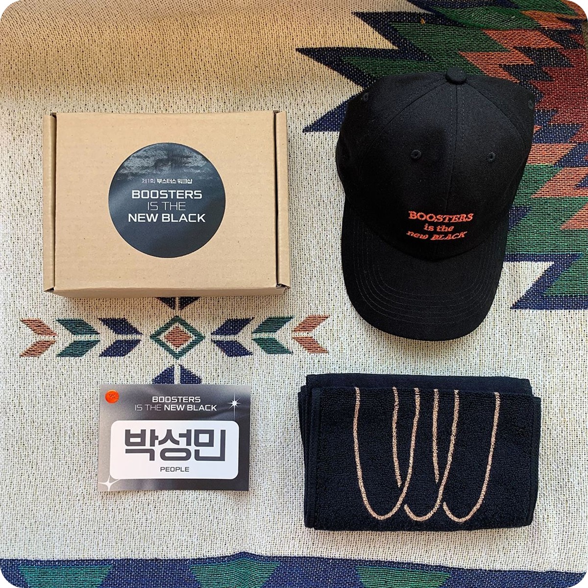 첫 워크숍의 콘셉트는 부스터스의 포부를 담은 BOOSTERS IS THE NEW BLACK 이었는데요. 부스터스가 커머스 업계의 새로운 기준이 되겠다는 내용을 담은 슬로건이었습니다. 우리의 워크숍을 추억할 수 있는 아이템을 고민하다 실용적이고 일상에서도 착용할 수 있는 모자와 응원 타월을 제작해 드렸어요. 전날 미리 나눠드려 옷과 맞춰 모자를 쓰고 오신 분들도 계셨습니다.