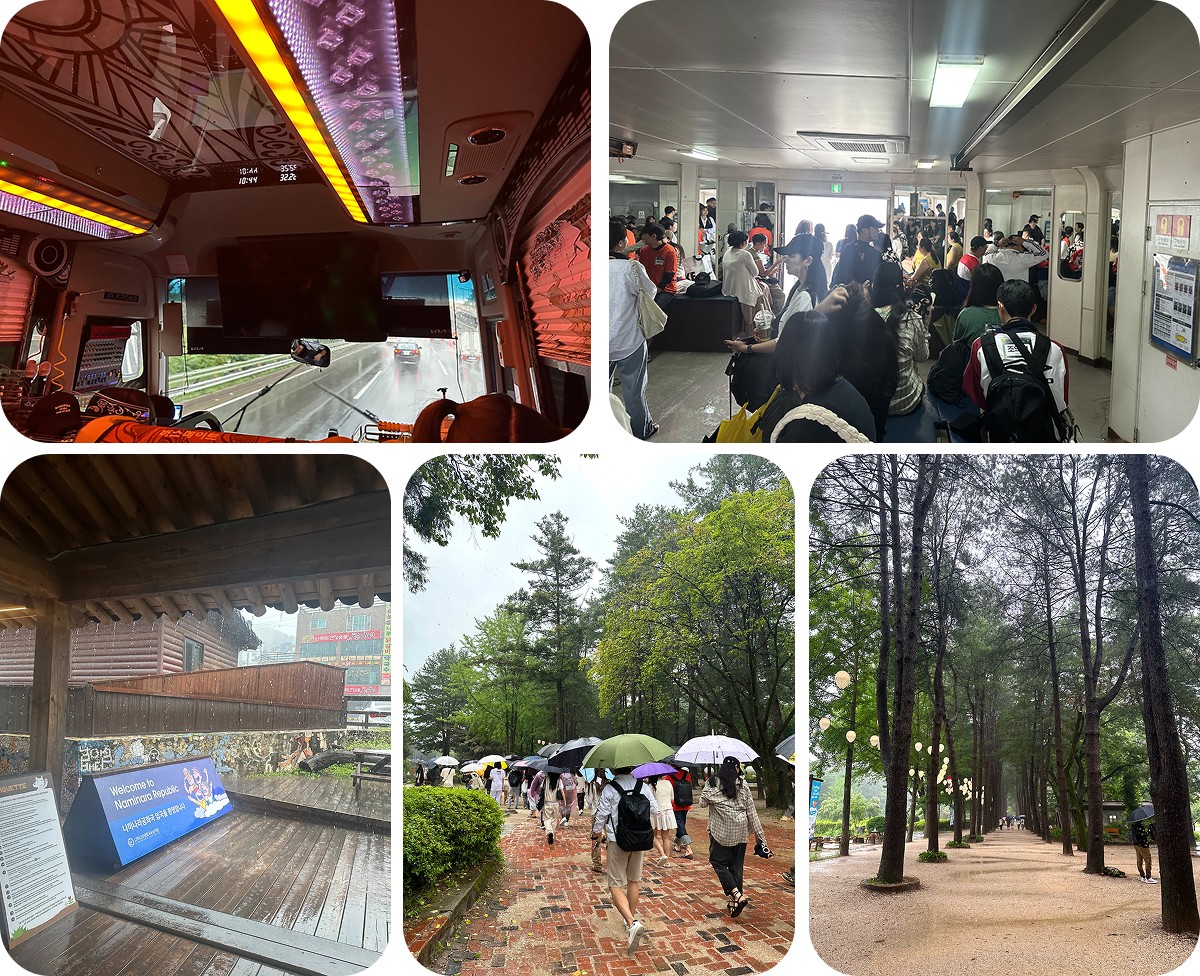 오전 10시 반 모두가 회사에 모여 대형 버스에 탑승해 남이섬으로 이동했습니다. 가는 길에 빗줄기가 점점 굵어져 걱정도 됐지만, 신나는 노래가 흘러나오는 버스로 이동하니 마치 어릴 적 소풍 가는 기분이더라고요. 또 대형 버스 두대로 나눠 이동하니 자리도 많고 쾌적해서 비 오는 날의 찝찝함을 느낄 겨를이 없었어요. 그렇게 한 시간 반 정도를 이동하고 남이섬에 도착했습니다.