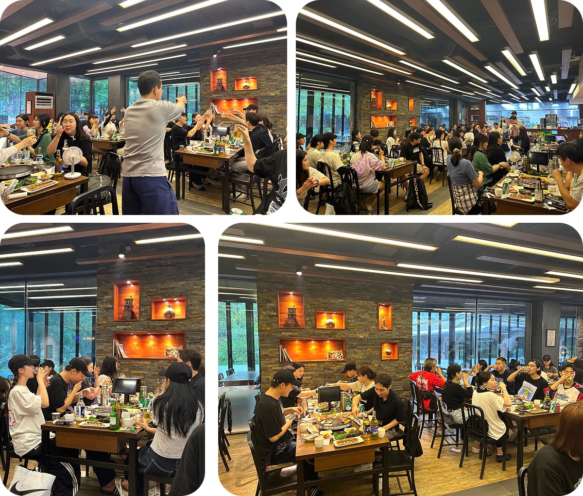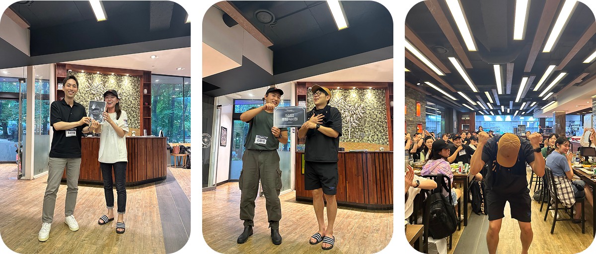 워크숍의 마지막은 오리 고기와 닭갈비, 메밀전병 등 맛있는 음식과 함께 했습니다. 하루종일 진행하느라 고생한 피플팀부터 비 오는 날에도 꿋꿋하게 워크숍을 잘 즐겨주신 크루 모두가 하루를 마무리하는 시간이었어요. 게임을 하며 친해진 팀원들과 충분히 얘기도 나눌 수 있는 자리가 되기도 했어요. 평소보다 정말 높은 텐션과 에너지가 느껴지는 자리였답니다.