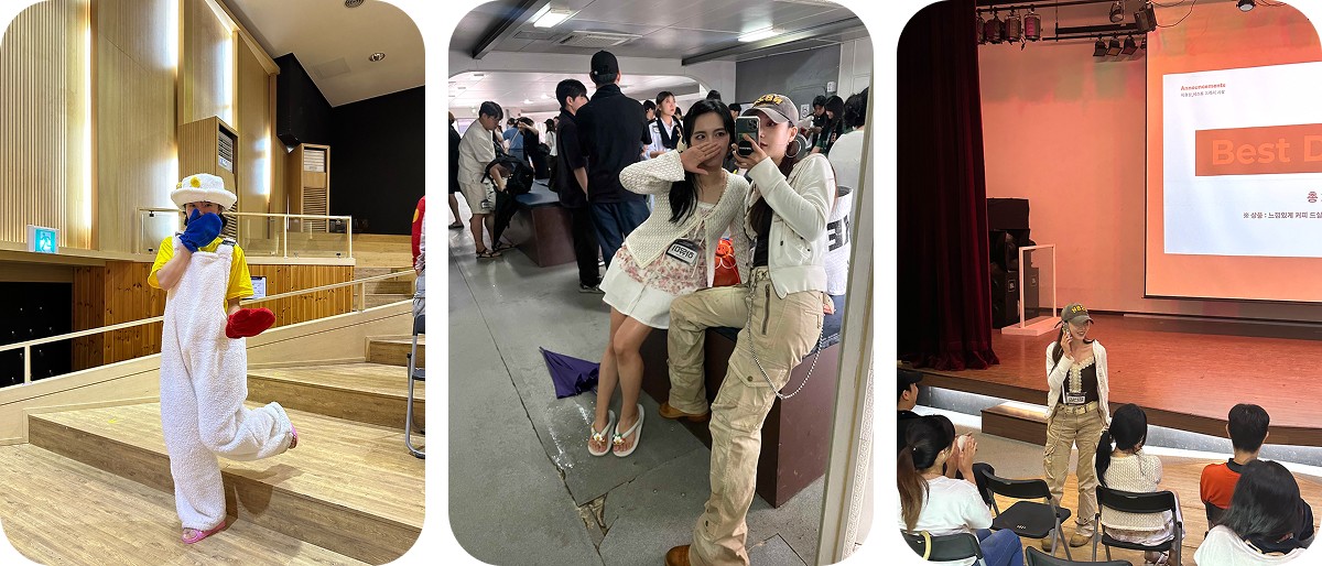 아래 사진을 보시면 알 수 있듯이 이날 베스트 드레서 콘셉트는 Y2K였습니다. 사실 버스로 이동하기 전부터 이미 우승은 정해져 있었어요. H.O.T.의 캔디를 패러디한 소연님, 풀하우스 송혜교 유미님, 그리고 렉시 선정님까지 강력한 우승 후보였죠. 본래 두 명만 뽑기로 했지만 우열을 가리기가 힘들어 세분이 베스트 드레서로 뽑혔답니다. 소연님은 모자에 달린 방울을 손수 만드시기도 하고, 유미님과 선정님은 2000년대의 상징과도 같은 추억의 가로본능 폰을 챙겨 오셨어요.