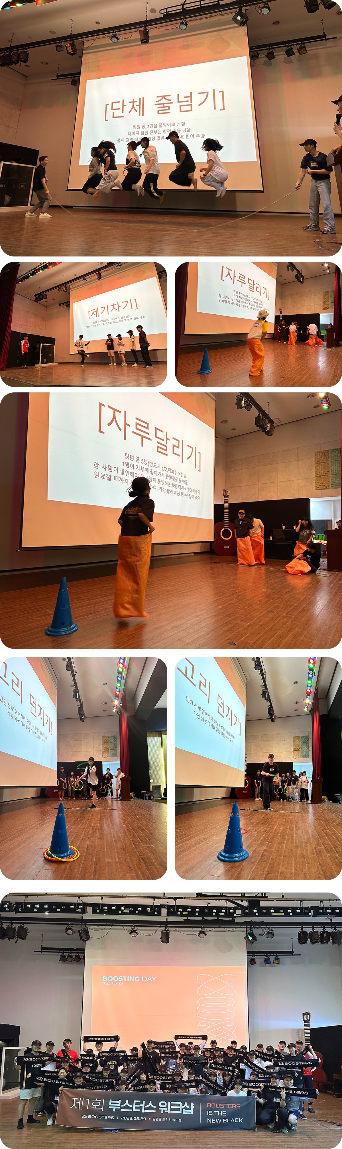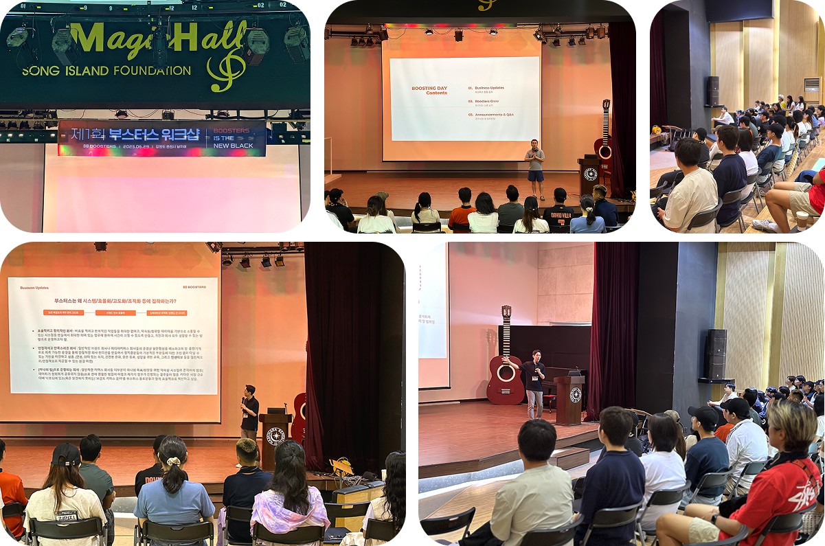 모두가 남이섬 내 매직 홀에 모여 6월 부스팅 데이를 진행했습니다. 매달 진행하던 방식대로 회사 주요 소식을 전하는 비즈니스 업데이트를 먼저 진행했습니다. 윤호 대표님이 직접 앞에 나와 부스터스의 비즈니스 모델에 대한 자세한 설명과 함께 앞으로 우리가 나아가야 할 방향에 대해 말씀 주셨어요. 그동안 앞만 보며 바삐 달렸던 우리를 다시 되돌아볼 수 있는 시간이 되었죠.