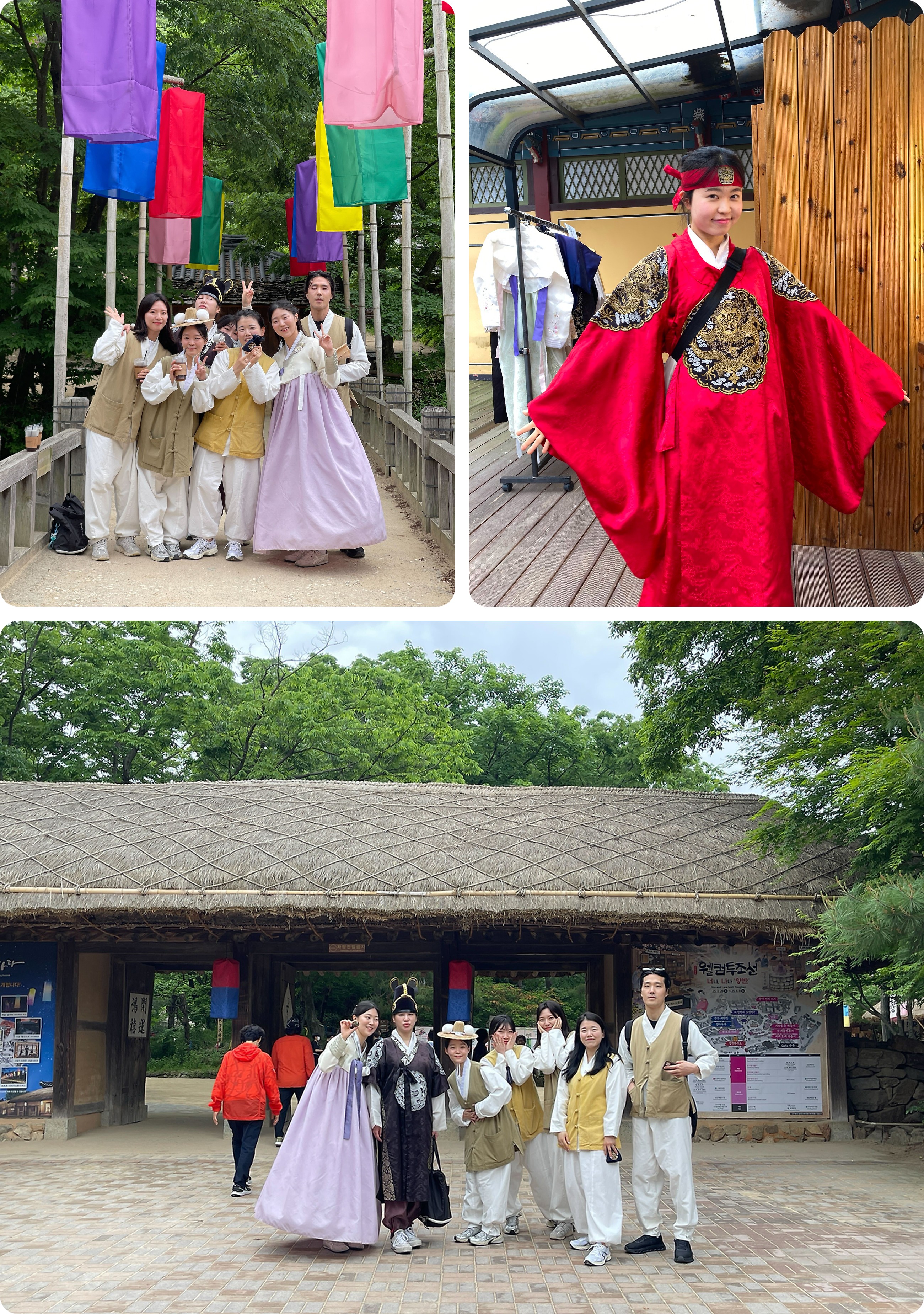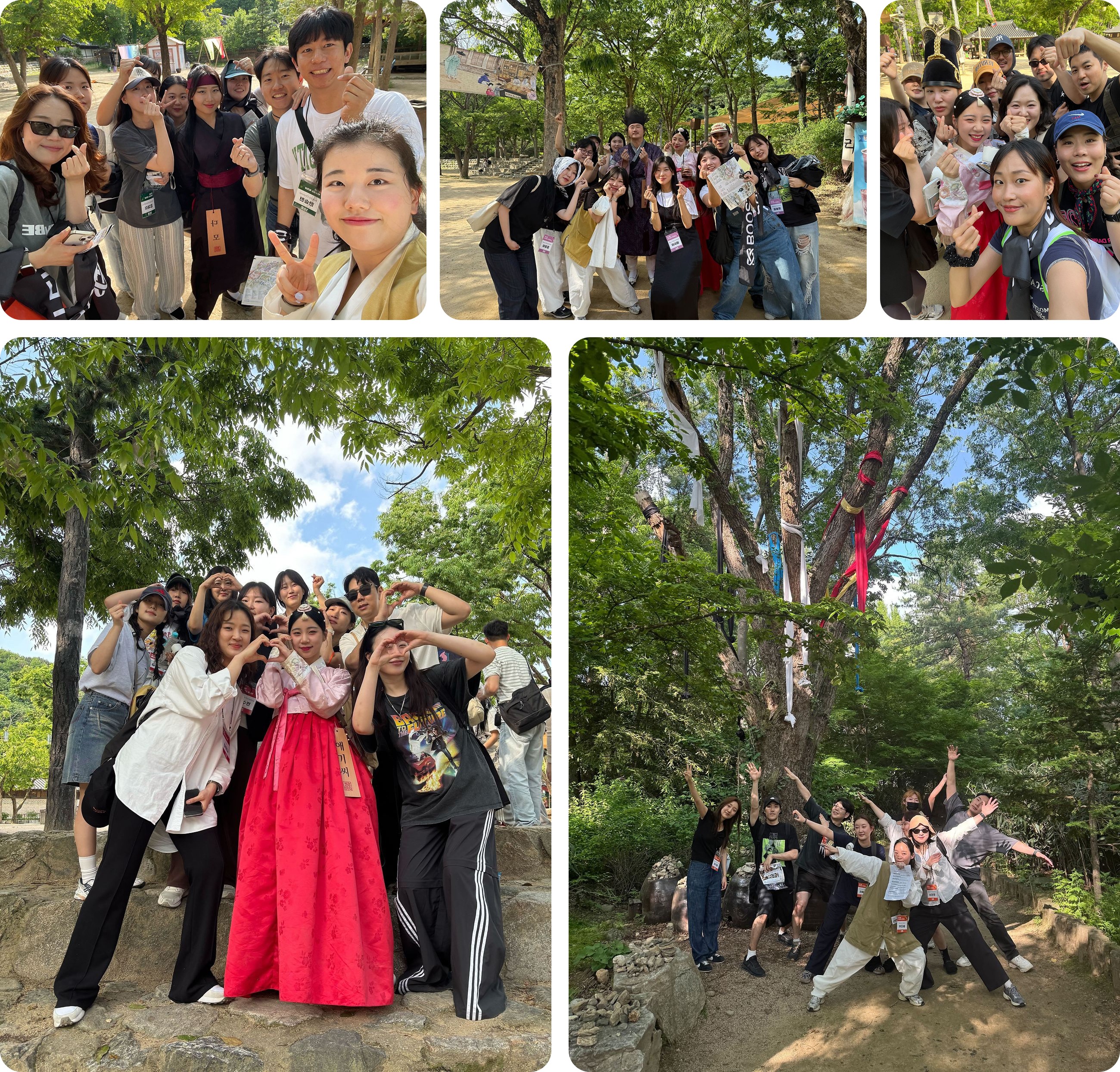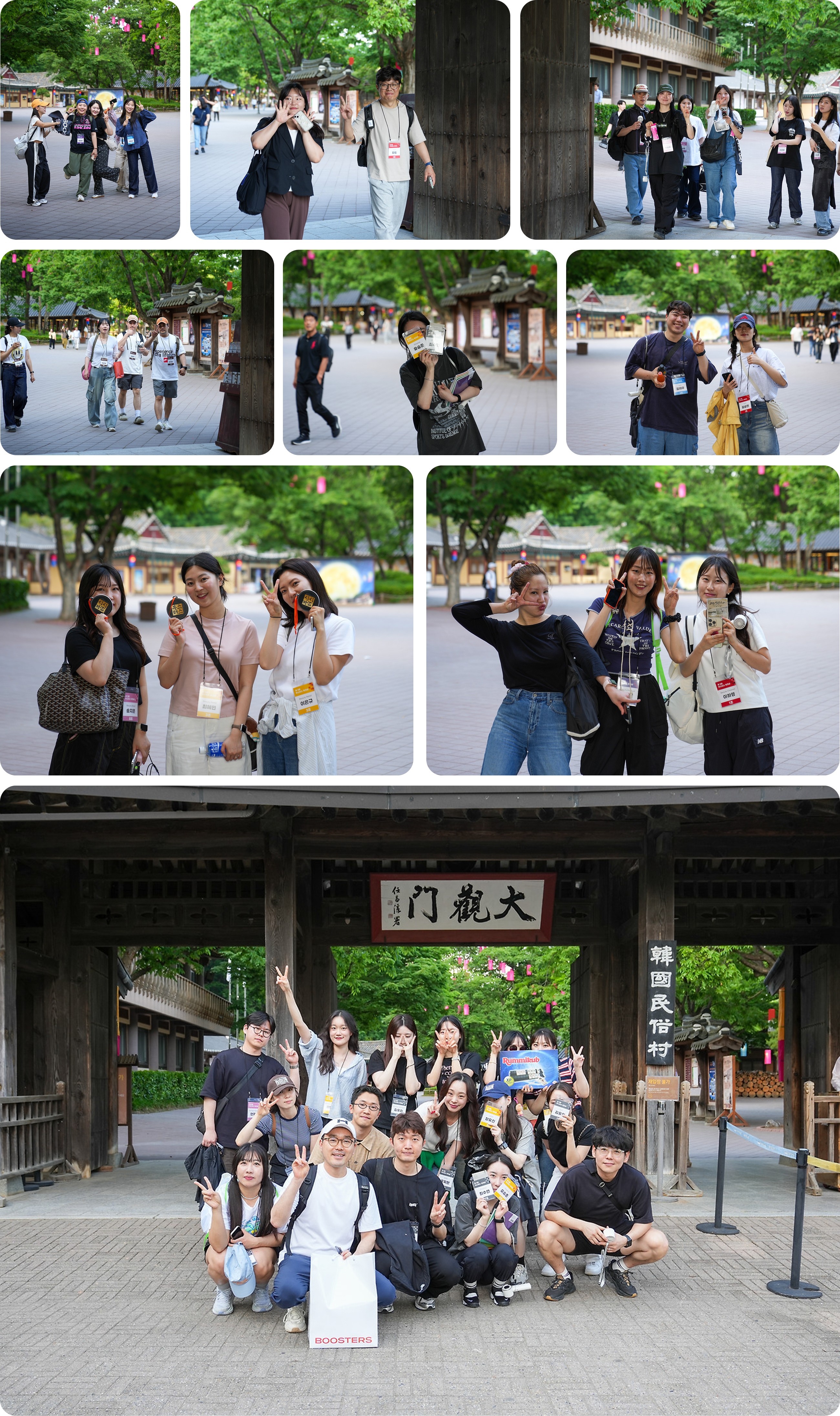 우리는 모두 대형버스에 몸을 싣고 다 함께 용인 민속촌으로 이동했어요. 도착하자마자 카메라 앞에서는 자연스럽게 손 브이를, 그리고 활짝 웃으며 설렘을 감추지 못한 크루들의 모습이 지금도 눈에 선합니다. 도착하자마자 점심시간과 자유시간을 즐기며 민속촌의 풍경에 자연스럽게 스며들었어요. 민속촌이라는 장소에 온만큼 한복착장은 기본이겠죠? 특히, 워크숍 사전 이벤트로 실시했던 '한복 착장 쿠폰 추첨'에서 뽑힌 크루들은, 더운 날씨에도 불구하고 이렇게 묵직한 한복을 입고 다녔답니다. 통풍이 되지 않아 꽤 더워 보였지만, 고운 색감의 전통 한복을 차려입은 당첨자들이 민속촌 곳곳을 누빌때마다, 민속촌에 방문한 다른 관광객들이 싸인 요청하거나 사진을 찍자고 했다는 것을 보니, 단연 저희 부스터스 크루들이 그날의 스타였음은 당연했겠죠?