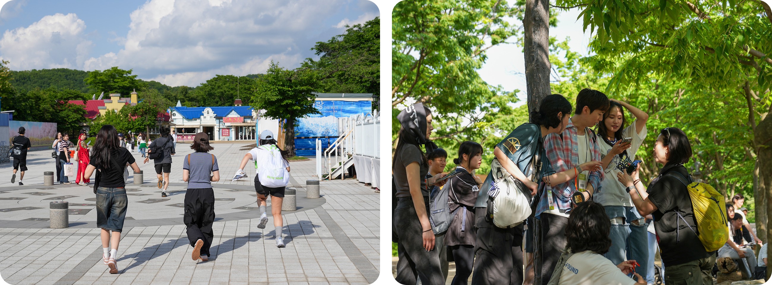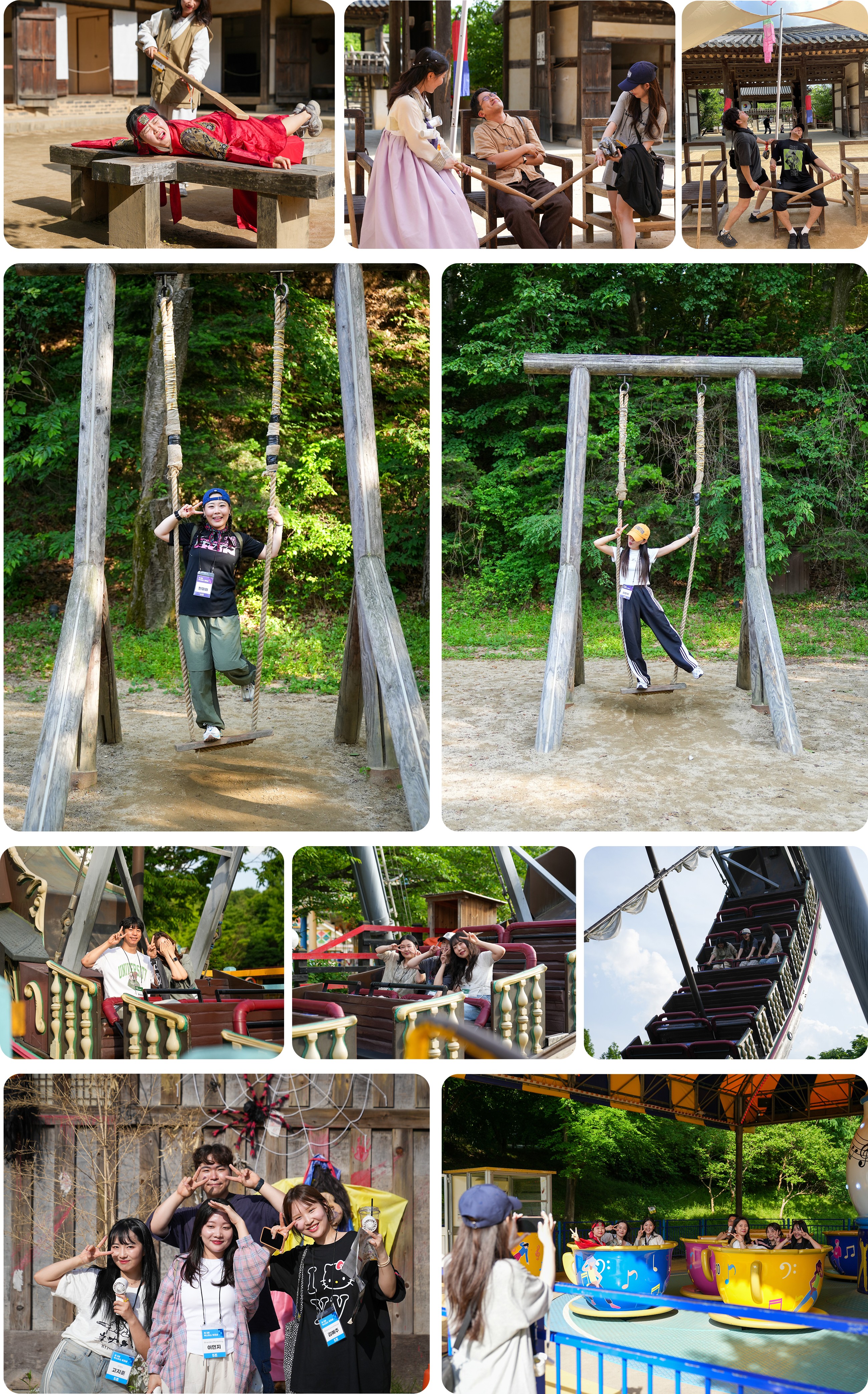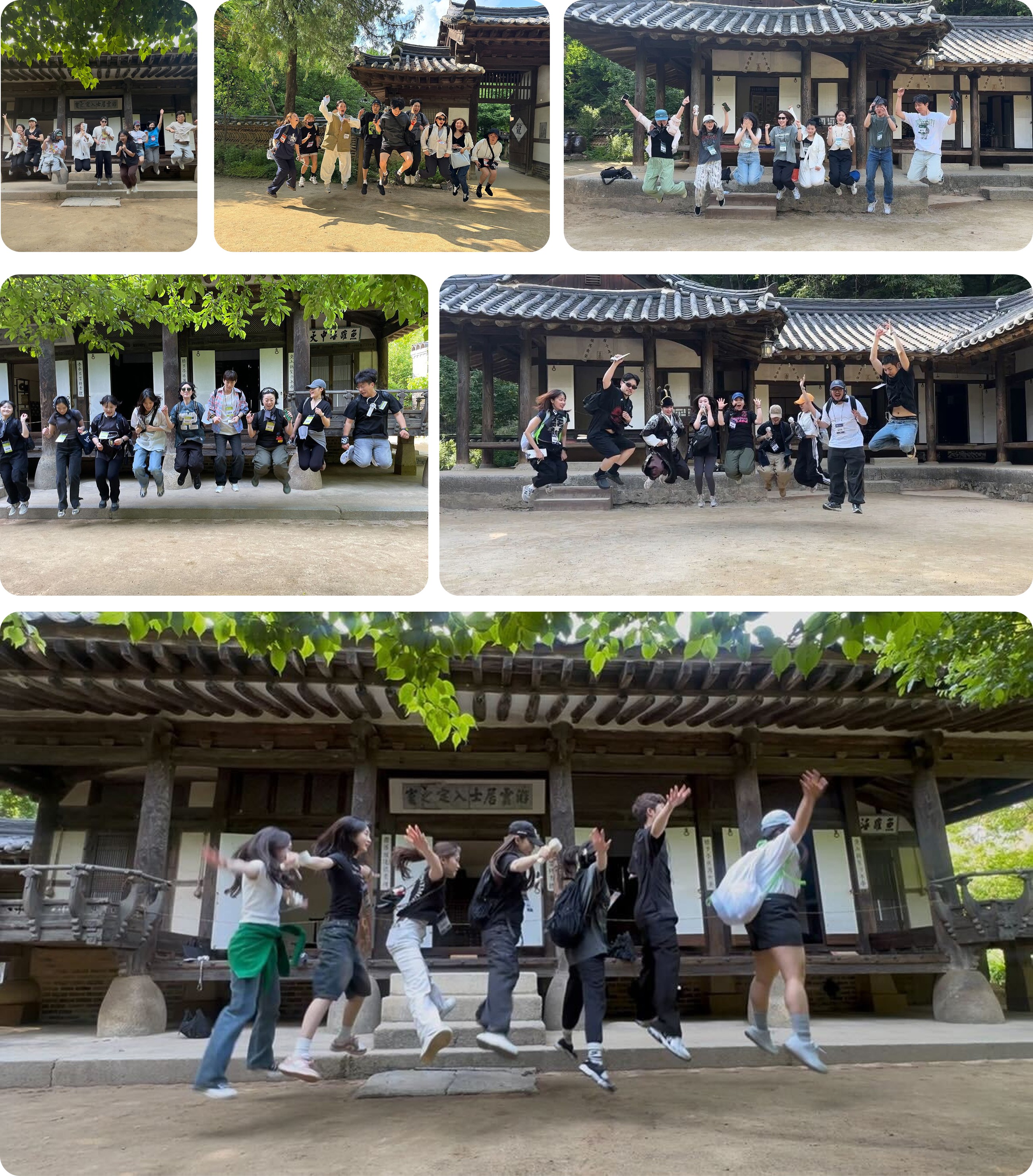 우리는 모두 대형버스에 몸을 싣고 다 함께 용인 민속촌으로 이동했어요. 도착하자마자 카메라 앞에서는 자연스럽게 손 브이를, 그리고 활짝 웃으며 설렘을 감추지 못한 크루들의 모습이 지금도 눈에 선합니다. 도착하자마자 점심시간과 자유시간을 즐기며 민속촌의 풍경에 자연스럽게 스며들었어요. 민속촌이라는 장소에 온만큼 한복착장은 기본이겠죠? 특히, 워크숍 사전 이벤트로 실시했던 '한복 착장 쿠폰 추첨'에서 뽑힌 크루들은, 더운 날씨에도 불구하고 이렇게 묵직한 한복을 입고 다녔답니다. 통풍이 되지 않아 꽤 더워 보였지만, 고운 색감의 전통 한복을 차려입은 당첨자들이 민속촌 곳곳을 누빌때마다, 민속촌에 방문한 다른 관광객들이 싸인 요청하거나 사진을 찍자고 했다는 것을 보니, 단연 저희 부스터스 크루들이 그날의 스타였음은 당연했겠죠?
