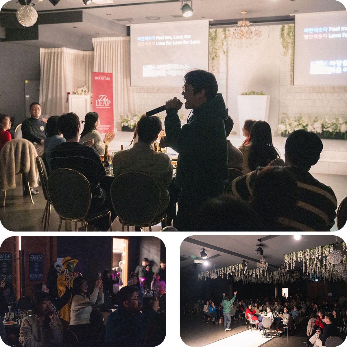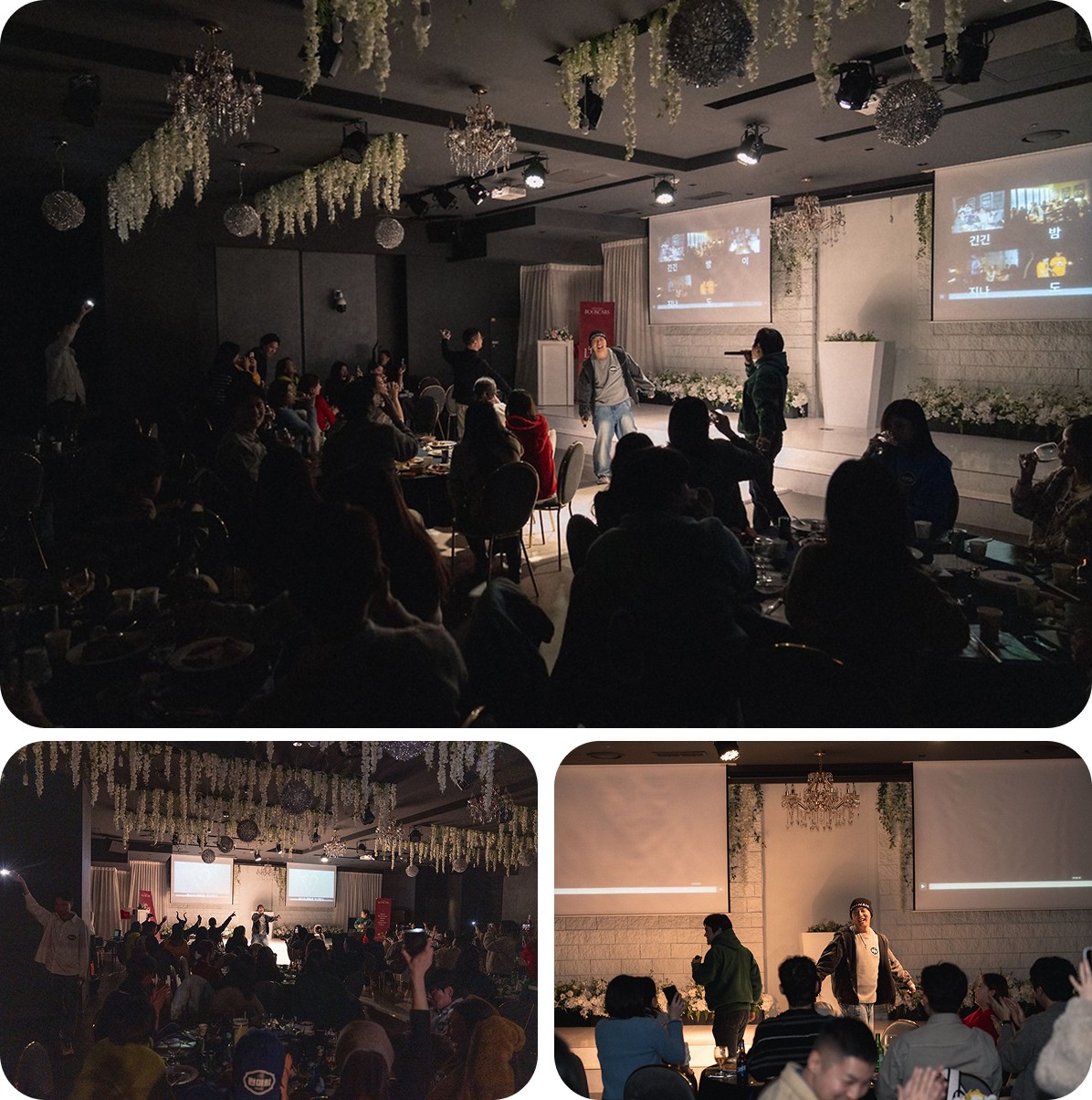 충분한 식사 시간을 가진 후에 송년회의 다음 순서를 위해 불이 꺼졌습니다. 매년 송년회마다 등장하는 부스터스 공식 가수 SCM팀의 리더 치호님이 무대에 섰습니다. 치호님의 에너지 넘치는 노래로 송년회의 시작을 알렸습니다. 사미인곡을 부르셨는데 모두가 함께 즐길 수 있도록 곡 중간에 따라 부를 파트를 짚어주시고, 테이블 별로 건배할 시간을 할애해 주셨습니다.