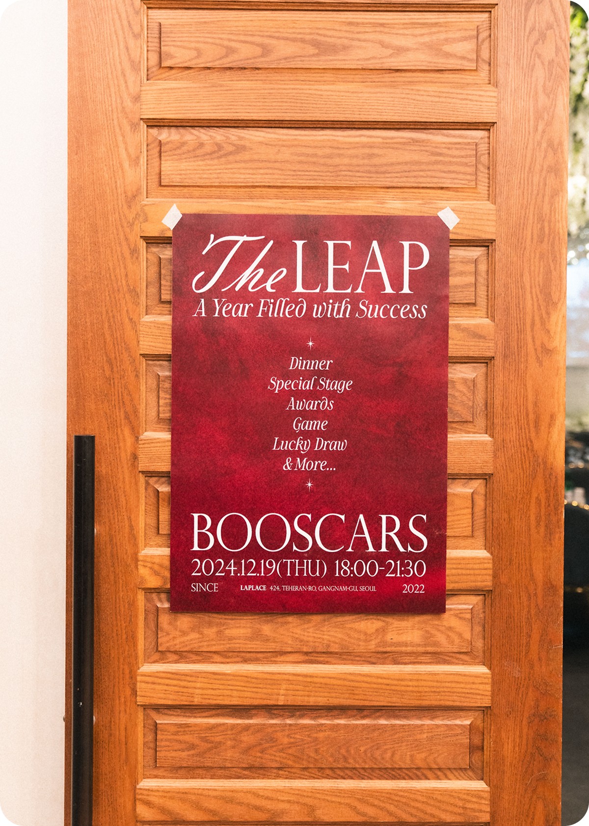 올해 송년회는 특별히 구성원들을 위한 미니 포토부스를 준비했어요. 개인은 물론 팀 별 사진도 넉넉히 찍어 간직할 수 있도록 말이죠. BOOSCARS 만을 위해 특별 제작한 디자인 프레임도 다양하게 준비해 사진의 종류에 따라 선택하는 재미가 쏠쏠했답니다.