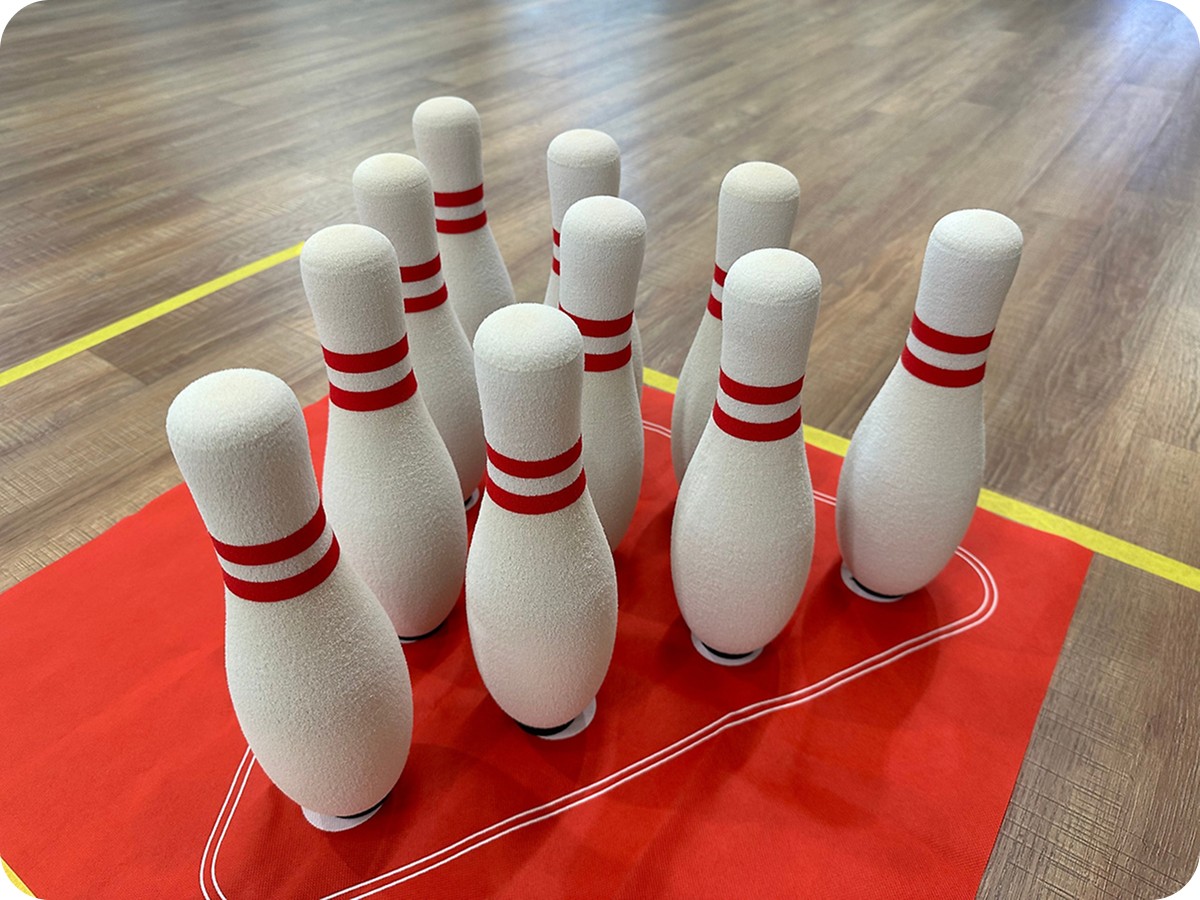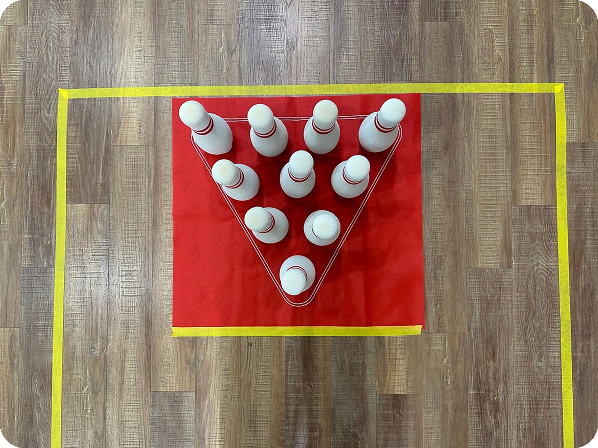 대회에 앞서 테이프를 바닥에 붙여 레인을 만든 뒤 볼링핀을 세웠습니다. 볼링공과 핀 모두 말랑말랑한 재질이어서 튕겨 나가더라도 파손이나 부상에 대한 걱정 없이 경기를 즐길 수 있었어요.