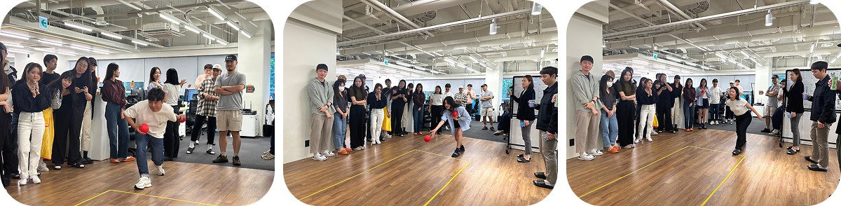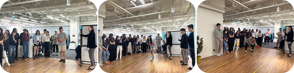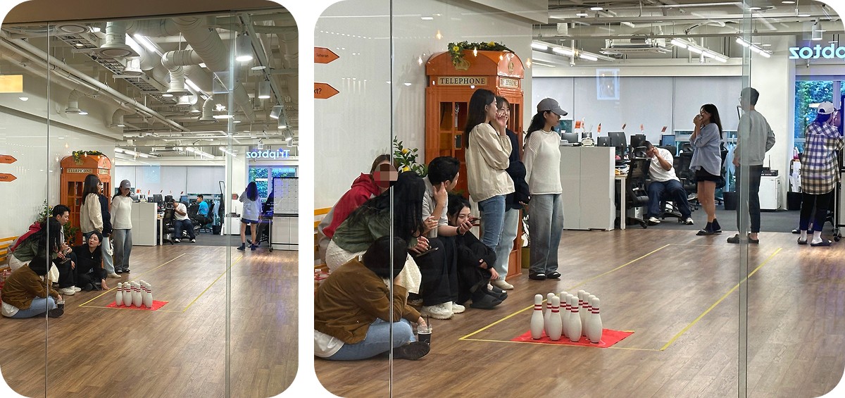 승부욕이 강한 크루들을 위해 분기마다 스포츠 대회를 열고 있는데, 다트, 알까기에 이어 이번에는 볼링을 채택했어요. 더욱 넓어진 사무실 공간을 십분 활용할 수 있는 종목이라고 생각했습니다. 이전에는 회의실에서 소수만 경기를 구경할 수 있었는데, 이제는 모두가 한 공간에 함께 모일 수 있게 됐습니다. 많은 분들의 응원과 환호 속에서 경기가 진행됐습니다.