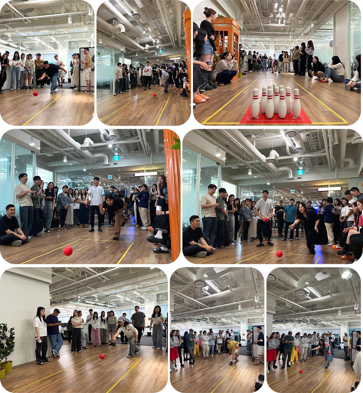 그렇게 16강, 8강, 4강전을 거치며 볼링 실력자들이 드러나기 시작했습니다. 점수를 한 번도 내지 못하는 분들도 계신가 하면 더블 스트라이크를 달성하신 분도 계셨어요. 쉬워 보이지만 일반 볼링공보다 가벼워 적절한 힘조절과 방향 감각이 필요해 점수를 내기가 꽤 까다로웠습니다. 그리고 점심시간 동안 진행하는 게임임에도 불구하고 많은 분들이 구경하고 응원하기 위해 모였어요. 경기가 끝날 때마다 그날의 사진들이 슬랙 커뮤니티에 올라오며 소소한 재미를 선사하기도 했습니다.