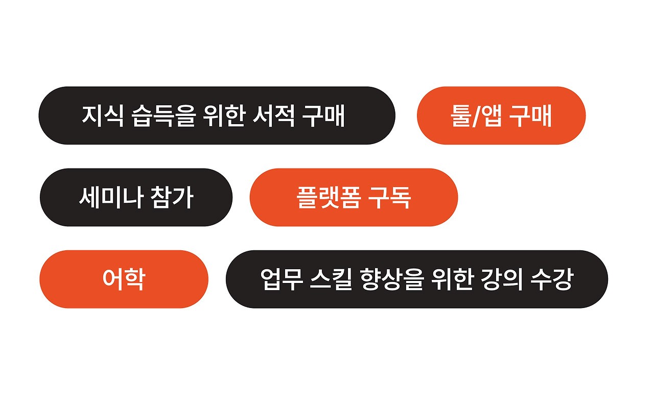 2023년 하반기에 부스터스 크루들이 사용한 성장지원비 항목을 살펴본 결과, 대부분 다양한 역량 개발을 위해 클래스101, 퍼블리, 밀리의서재 등 특정 플랫폼을 구독하시는 분들이 많았습니다. 혹은 강의료가 꽤 비싸 그동안 망설였던 강의를 구매해 수강하기도 하고, 업무에 필요한 툴이나 앱을 구매해 사용하는 분도 계셨습니다.