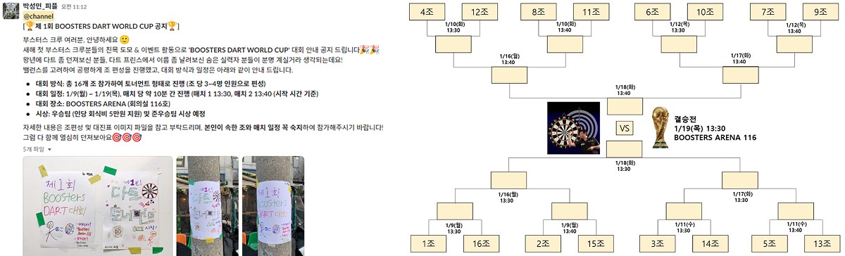 새해를 맞아 지난달 부스터스에는 특별한 대회가 열렸습니다 :) 바로 제1회 BOOSTERS DART WORLD CUP 인데요! 부스터스 피플팀은 매달 크루분들의 친목 도모를 위해 소소한 이벤트를 준비하고 있는데, 1월에는 전사 다트 대회를 개최하기로 했습니다.