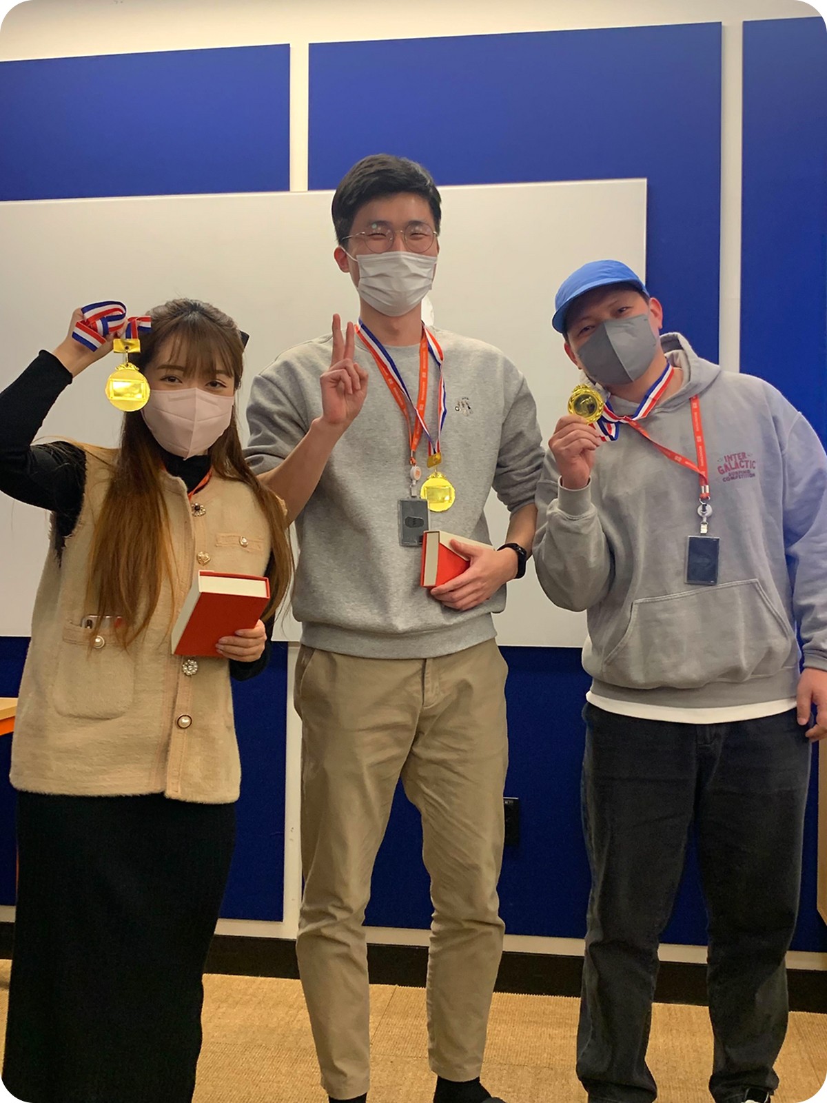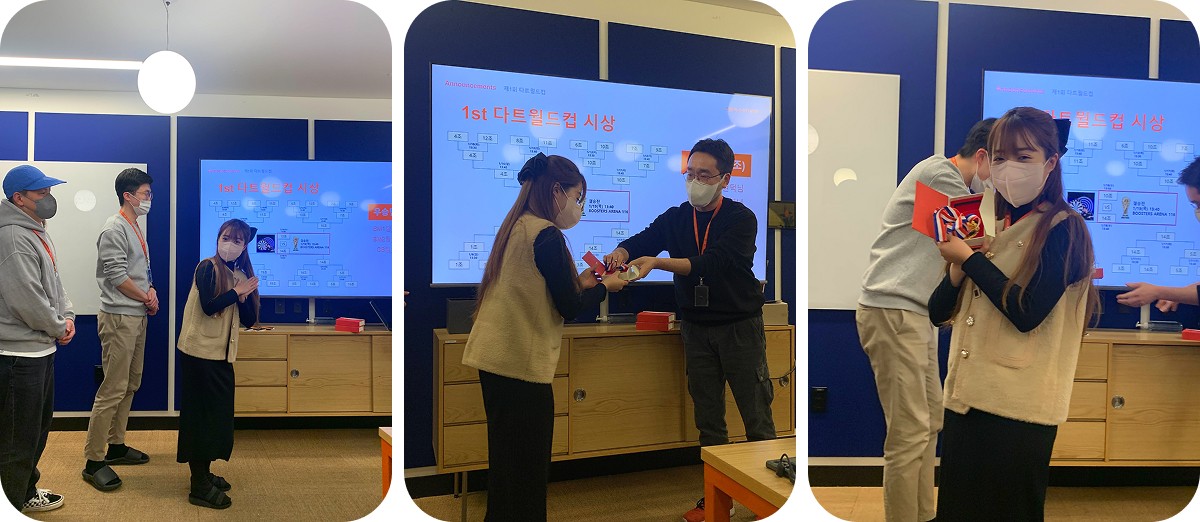 우승팀을 위한 시상은 매달 진행하는 타운홀미팅인 Boosting Day 에서 진행했습니다. 피플팀 리더 용환님이 직접 메달을 수여해 주셨어요. 순금 99.9% 의 메달이지만 쇠독은 조심하라고도 말해주셨죠..ㅋㅋㅋㅋ