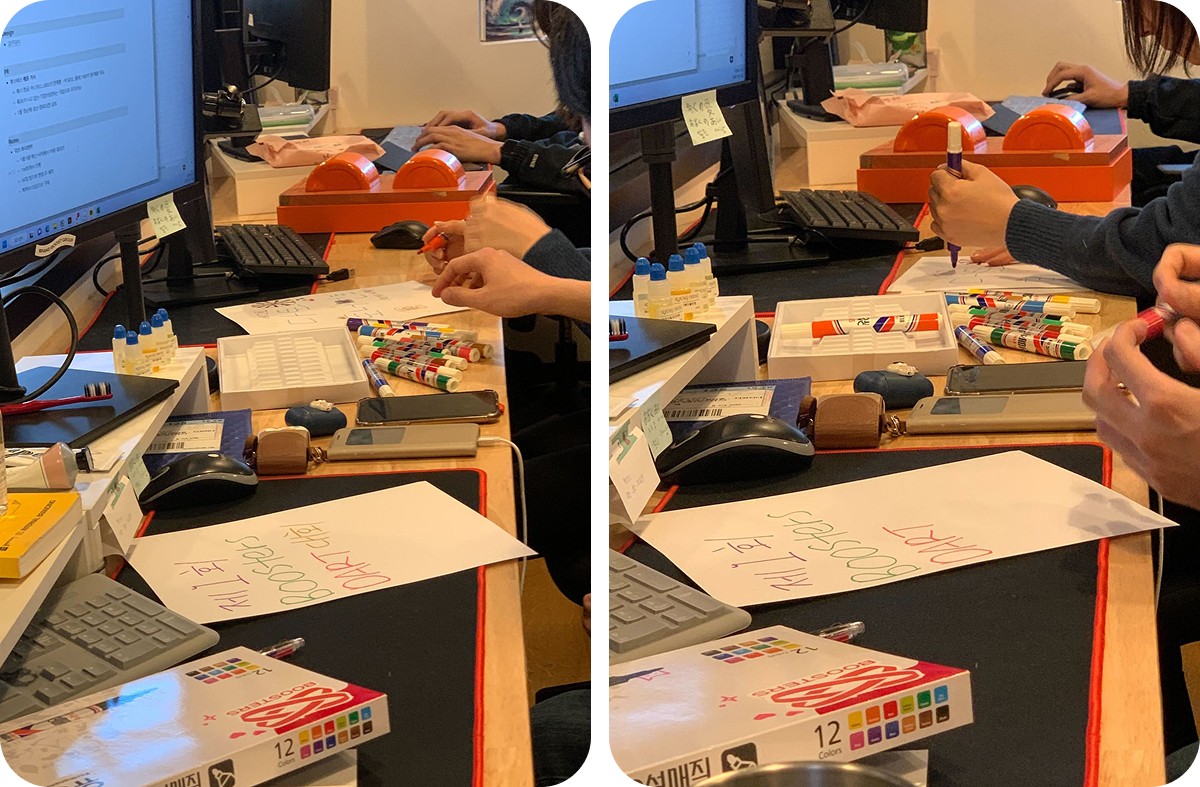 아무리 소소한 행사여도 포스터는 있어야겠죠? 크루들의 흥미를 돋우기 위한 재밌는 포스터를 만들기로 했습니다. 모두가 동심으로 돌아가 게임을 즐기길 바라는 마음으로 포스터 디자인에 심혈을(?) 기울였답니다. 오른손잡이임에도 일부러 왼손으로 그리기도 하고, 다양한 컬러를 사용해 포스터를 완성했어요.