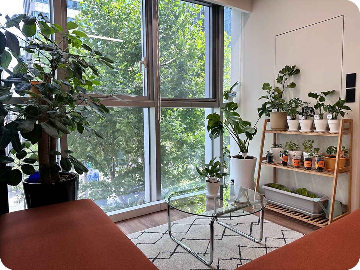 그리고 이번 확장과 함께 새롭게 생겨난 공간이 있습니다. 바로 구성원들이 점심시간 혹은 업무 중 잠시 휴식을 취할 수 있는 공간인 미니 라운지입니다. 초록초록한 식물에 둘러싸여 테헤란로 뷰를 감상할 수 있는 공간으로 준비했어요. 하루의 절반 이상을 보내는 사무실인 만큼, 쾌적한 환경을 만들기 위해 노력하고 있답니다.