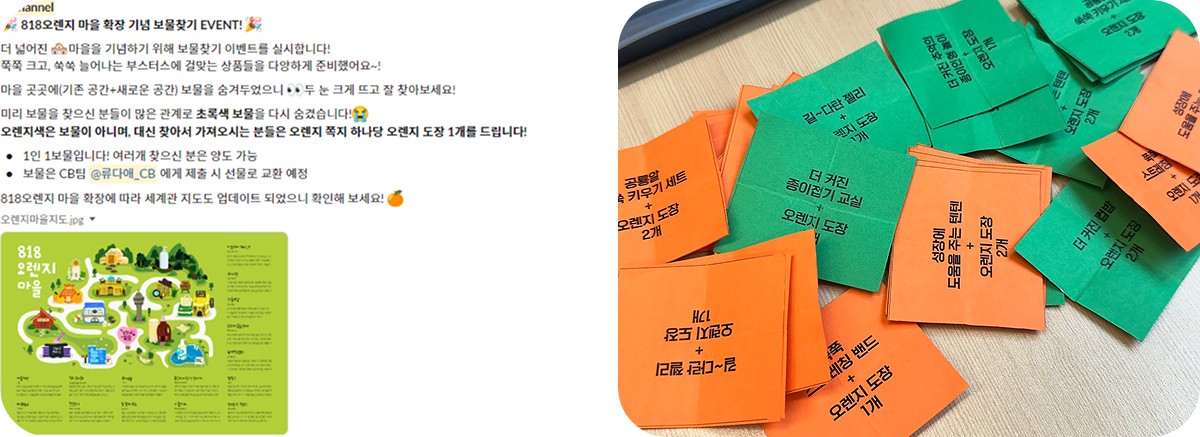 보물찾기 상품에 더해 오렌지 도장도 찍어 드렸습니다. 오렌지 도장을 10개 모으면 부스터스만의 특별한 오렌지 그립잇, 그리고 20개를 모으면 오렌지 한 박스를 집으로 배송드리고 있어요. 이번 보물찾기 이벤트 덕분에 도장을 다 채워 처음으로 오렌지 한 박스를 받으신 분들도 계셨습니다.