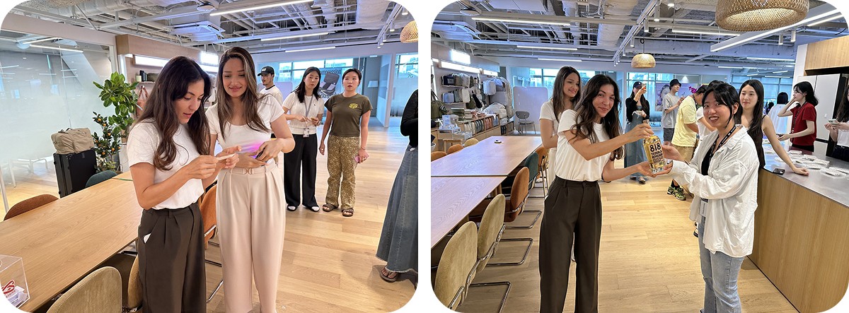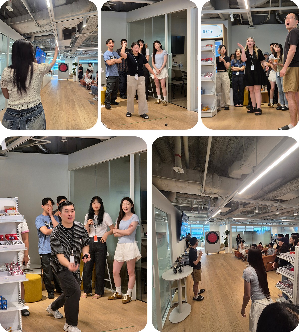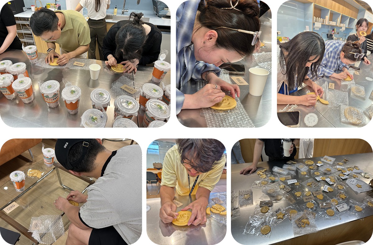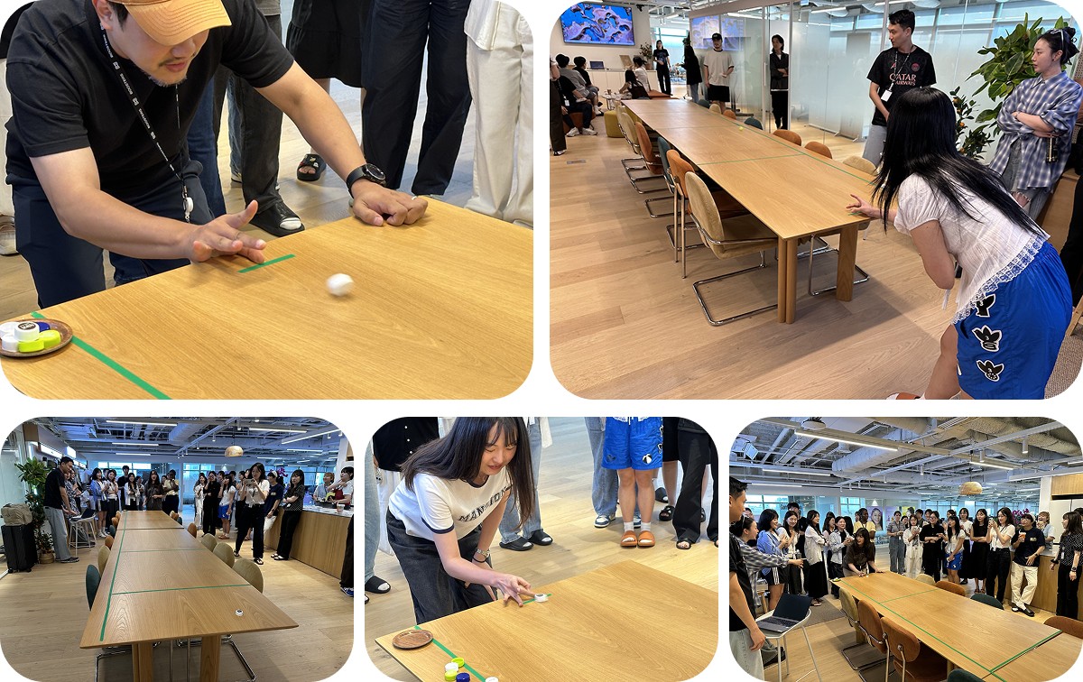 캔틴 중앙에 위치한 긴 테이블은, 마치 병뚜껑 튕기기 게임을 위해 태어난 것 같았어요. 매끄러운 표면에 항상 수평을 유지하는 완벽한 밸런스, 게다가 병뚜껑의 Color를 더욱 돋보이게 해주는 천연 원목 그대로의 텍스처까지... 그야말로 완벽한 그라운드였습니다. 테이블 구간별로 정해진 점수 구역에 병뚜껑이 정확하게 정지해야만 점수가 인정되는 구조! (물론 테이블 밖으로 튕겨나가면 낙! ❌) 최고점을 찍는 크루들이 속속 등장하면서 마지막까지 손에 땀을 쥐게 하는 치열한 경쟁이 펼쳐졌습니다. 눈으로 보는 것보다 손맛이 어려웠던, 뜨거운 병뚜껑 한 판이었어요!