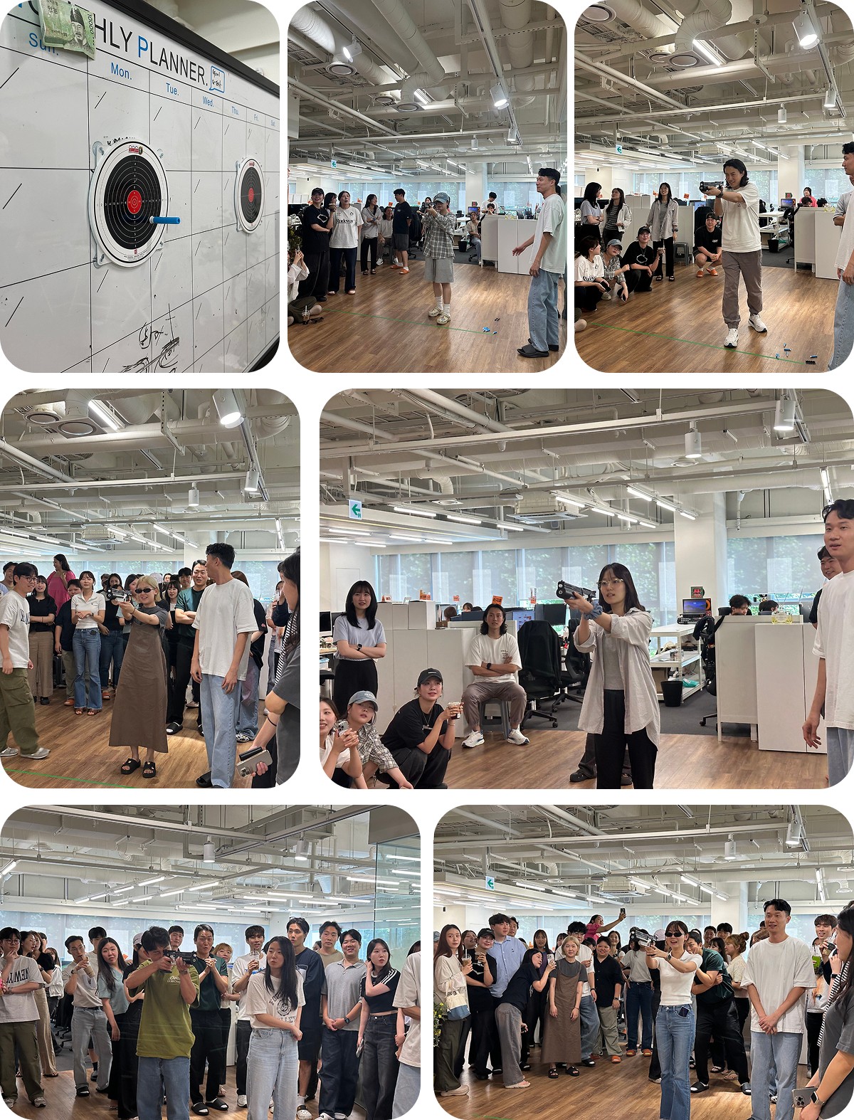 그리고 드디어 올림픽 마지막 날이 되었습니다. 마지막 날답게 한 팀도 빠짐없이 점수를 내며 치열한 경기를 펼쳤습니다. 발사된 흡착탄이 과녁에 붙지 않으면 점수로 인정이 되지 않아 정확한 조준과 약간의 운이 요구되는 꽤 어려운 게임이었습니다. 1등은 총 16점을 쏜 Tech팀과 CHRO소속 팀이 공동으로 가져갔습니다. 2등은 1등과 불과 1점 차이였던 D2C팀, 그리고 3등은 Finance팀이 차지했습니다.
