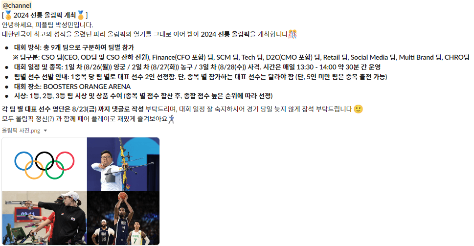 부스터스는 팀빌딩의 일환으로 분기 별로 미니 스포츠 대회를 개최하곤 합니다. 그리고 이번에는 우리 모두에게 크나큰 기쁨을 선사했던 파리 올림픽의 열기를 부스터스에서 이어가 보기로 했습니다. 올림픽이라는 이름에 걸맞게 이번에는 무려 세 가지의 종목을 준비했습니다. 바로 양궁, 농구, 그리고 사격입니다.