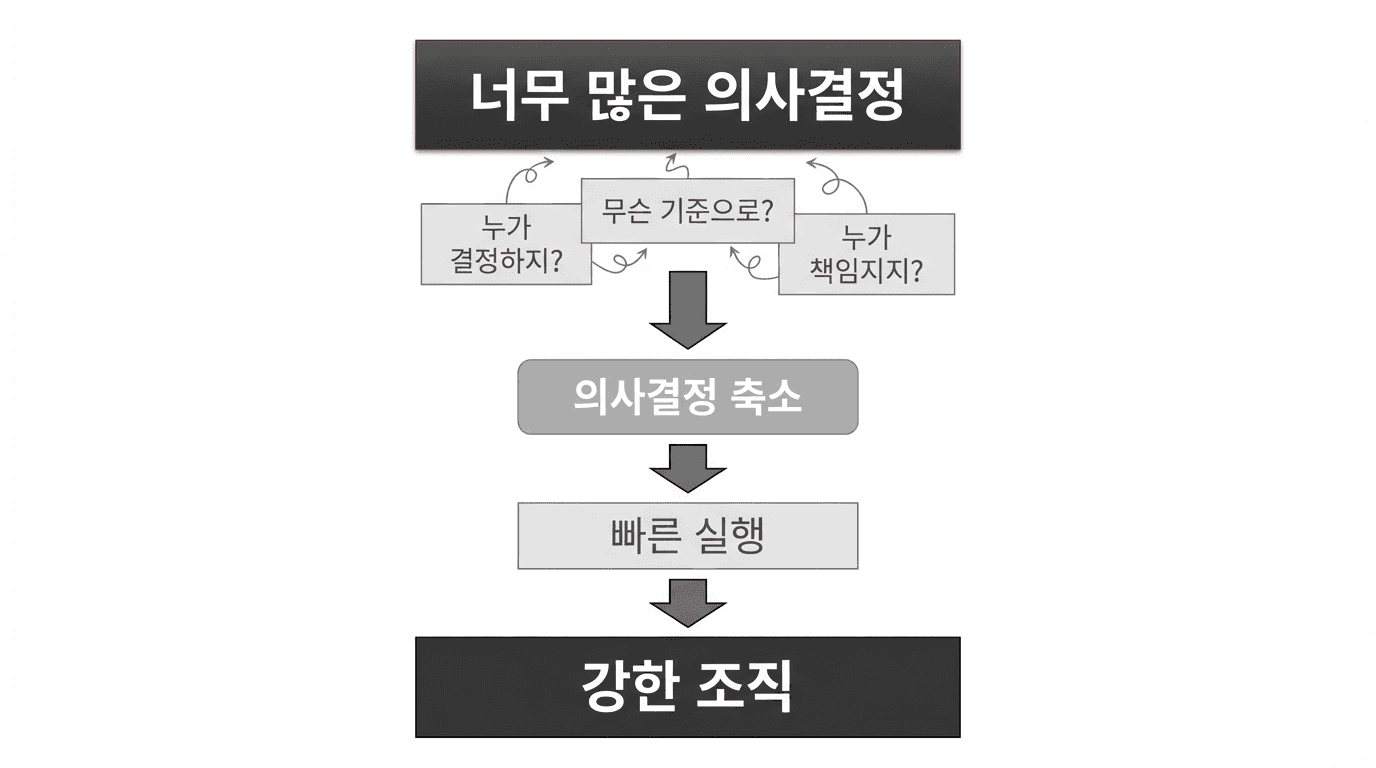 누가 결정해야 하는지 고민하고 어떤 기준으로 선택해야 하는지 고민하고 책임이 어디에 있는지 고민하는 순간 조직의 속도는 급격히 느려진다.