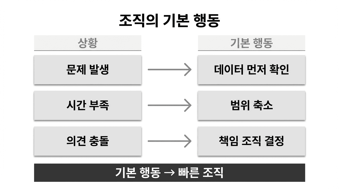 이러한 행동이 개인의 역량이 아니라 조직의 기본값(Default)으로 작동할 때 조직은 빠르게 움직인다. 강한 조직은 뛰어난 판단을 기대하는 것이 아니라, 예측 가능한 행동 패턴을 설계하는 조직이다.