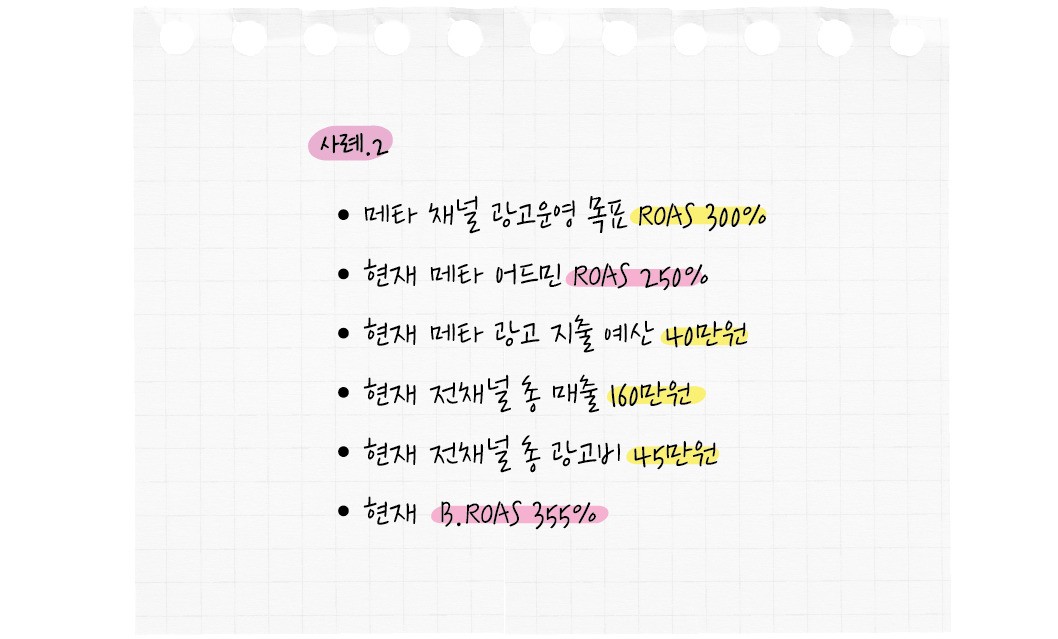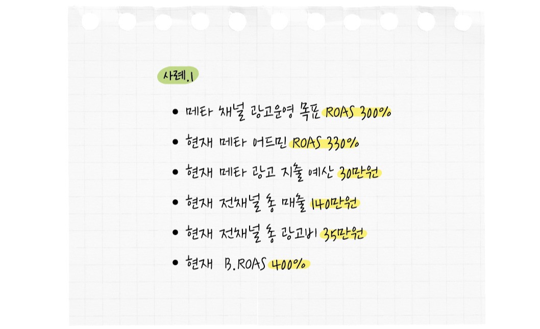 광고비를 늘렸더니 메타 ROAS가 크게 줄었습니다. 메타 ROAS 만 보면 250%로 줄었지만 총매출액은 바로 전의 140만 원에서 160만 원으로 증가했습니다. 총 이익액의 관점에선 더 긍정적인 상황일 수 있겠지요? 이는 메타가 기여했지만 기술적 한계로 카운팅 하지 못한 다양한 트래픽을 통해 매출 상승효과가 있었다고도 생각해 볼 수 있겠습니다. B.ROAS 관점(이익적 사고)에서는 이전 상황보다 더 준수한 마진과 매출을 기록하는 상황으로 평가할 수 있어 메타 광고 ROAS 가 설령 줄었더라도 광고 예산을 채널에 더 과감하게 할당해 볼 수도 있겠습니다.