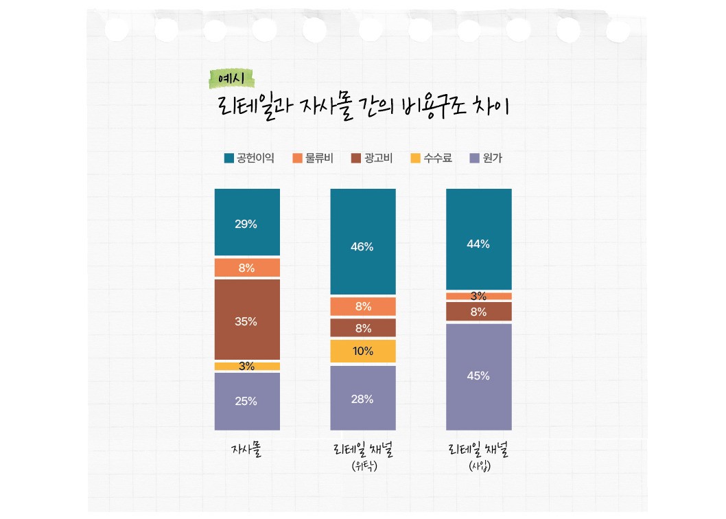 하지만 리테일 채널은 자사몰과 다르게 광고비가 그리 많이 필요하지 않습니다. 대신 채널 수수료라는 것이 존재합니다. 주문이 발생할 때마다 리테일 채널에서 일정 비율의 수수료를 걷어갑니다. 수수료율은 주문금액의 8~11%, 조건에 따라서는 30~50%까지 다양합니다. 이런 차이 때문에 채널 간 비용 구조가 달라집니다. 자사몰에서는 광고비를 지불해 매출을 내고, 리테일 채널에서는 광고비 대신 수수료를 지불하는 것이지요.