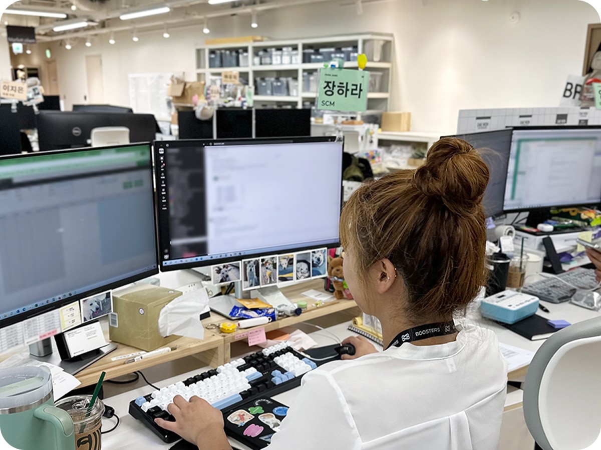안녕하세요. 부스터스 SCM본부 Logistics팀에서 제품관리 파트를 맡고 있는 장하라입니다. 저는 제품의 품질 관리와 물류 전반을 책임지고 있습니다. 제품이 출시된 이후에도 품질을 유지하고 개선하기 위해 다양한 협력사와 긴밀히 소통하며, 샘플링 검품과 품질 기준 설정 같은 세부 업무를 진행합니다. 이와 함께 효율적인 품질 관리 프로세스를 구축해 부스터스의 품질 관리 시스템을 한층 고도화하고 있습니다. 물류 입출고와 반품 관리 업무 역시 체계적인 기준을 세워 관리함으로써, 전반적인 업무 흐름이 원활하게 이어지도록 하고 있습니다.